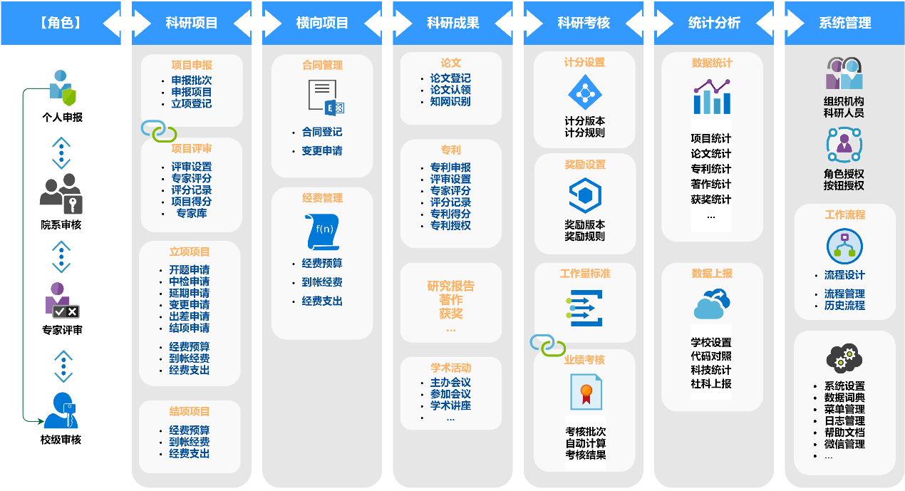 围绕科研核心业务,逐步实现各类科研业务规范管理和高效服务,通过分类业务信息化,简化各类业务报表和流程,提升科研管理质量和效率。
